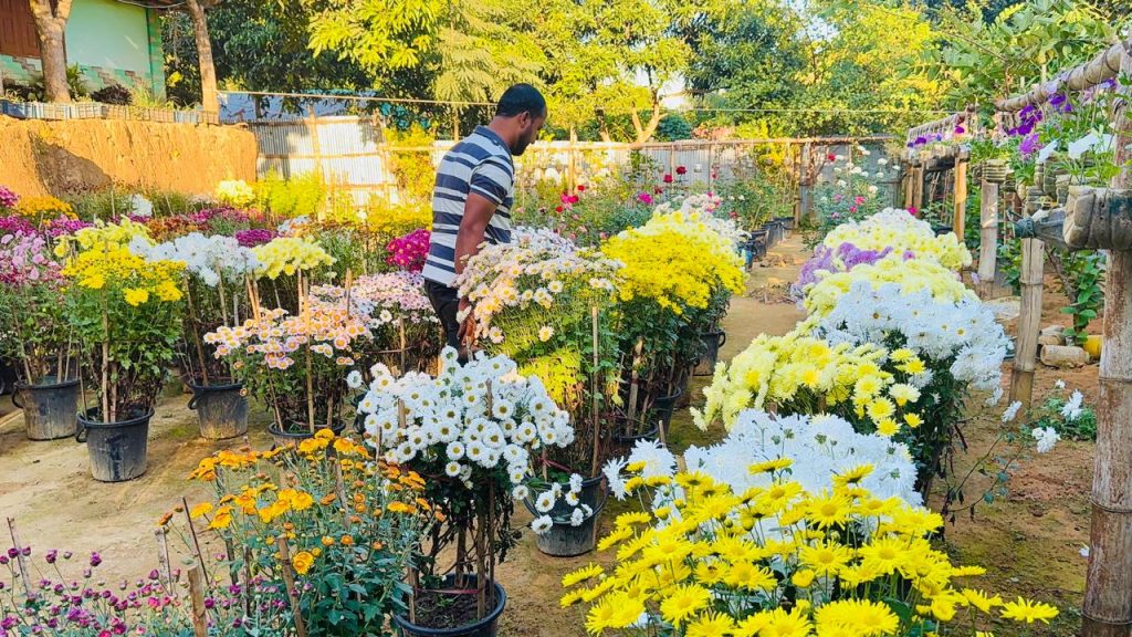 বাগানে ঢুকতেই দর্শনার্থীদের চোখে পড়ে সারি সারি টবে সাজানো চন্দ্রমল্লিকা। বিশেষ করে সাদা চন্দ্রমল্লিকার পূর্ণ বিকশিত রূপ দেখে মনে হয় যেন স্নিগ্ধতার এক প্রদর্শনী চলছে। নাসরিন ও মাসুদুল দম্পতি জানান, তাঁদের বাগানে কেবল চন্দ্রমল্লিকাই রয়েছে প্রায় ৭০ প্রজাতির। এর বাইরেও আছে থাইল্যান্ডের উন্নত জাতের গোলাপসহ প্রায় ৩০ ধরনের গোলাপ। টবে ঝুলছে রঙিন পিটুনিয়া, আর মাটিতে শোভা পাচ্ছে গাঁদা, ডালিয়া, গ্যাজেনিয়া, পোত্তলিকা ও সেলোসিয়াসহ নানা জাতের ফুল।